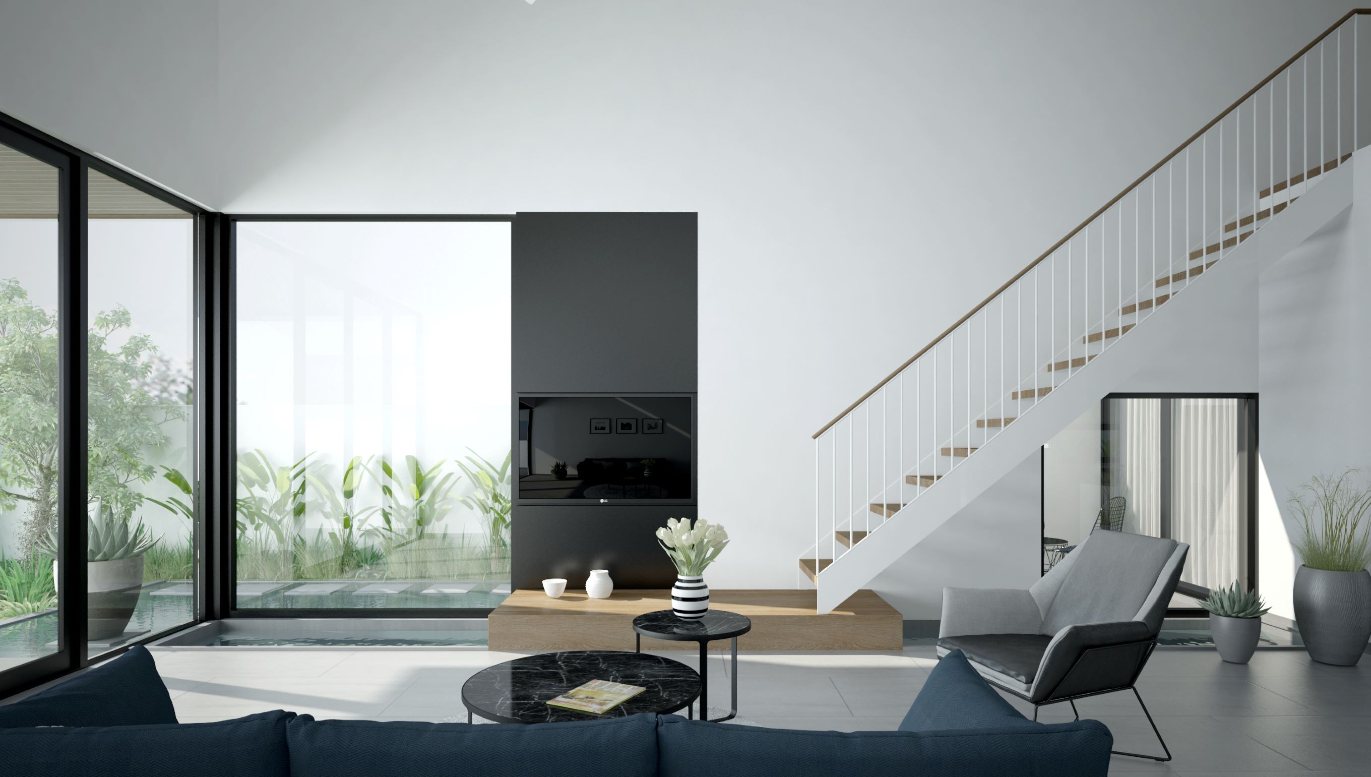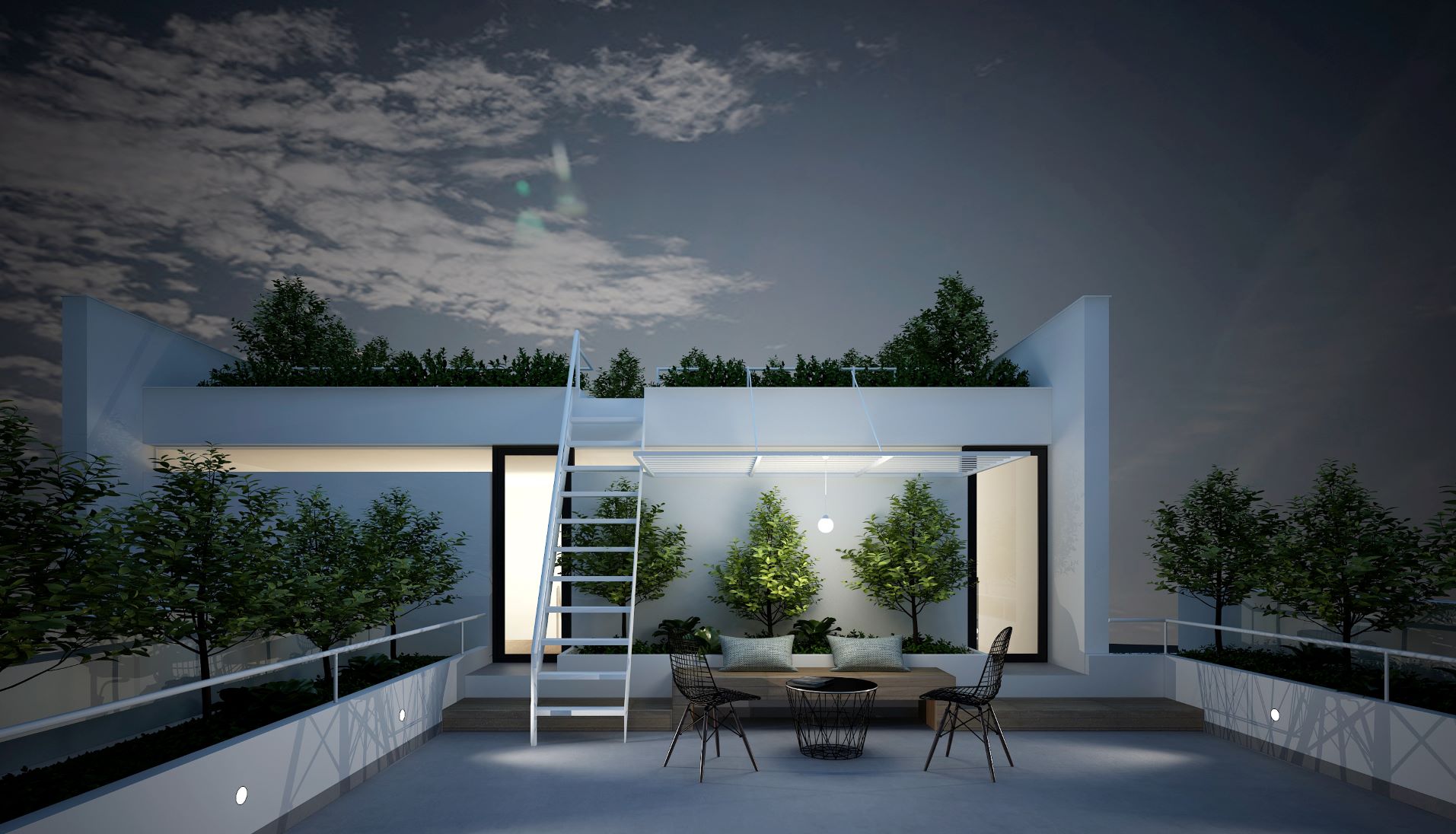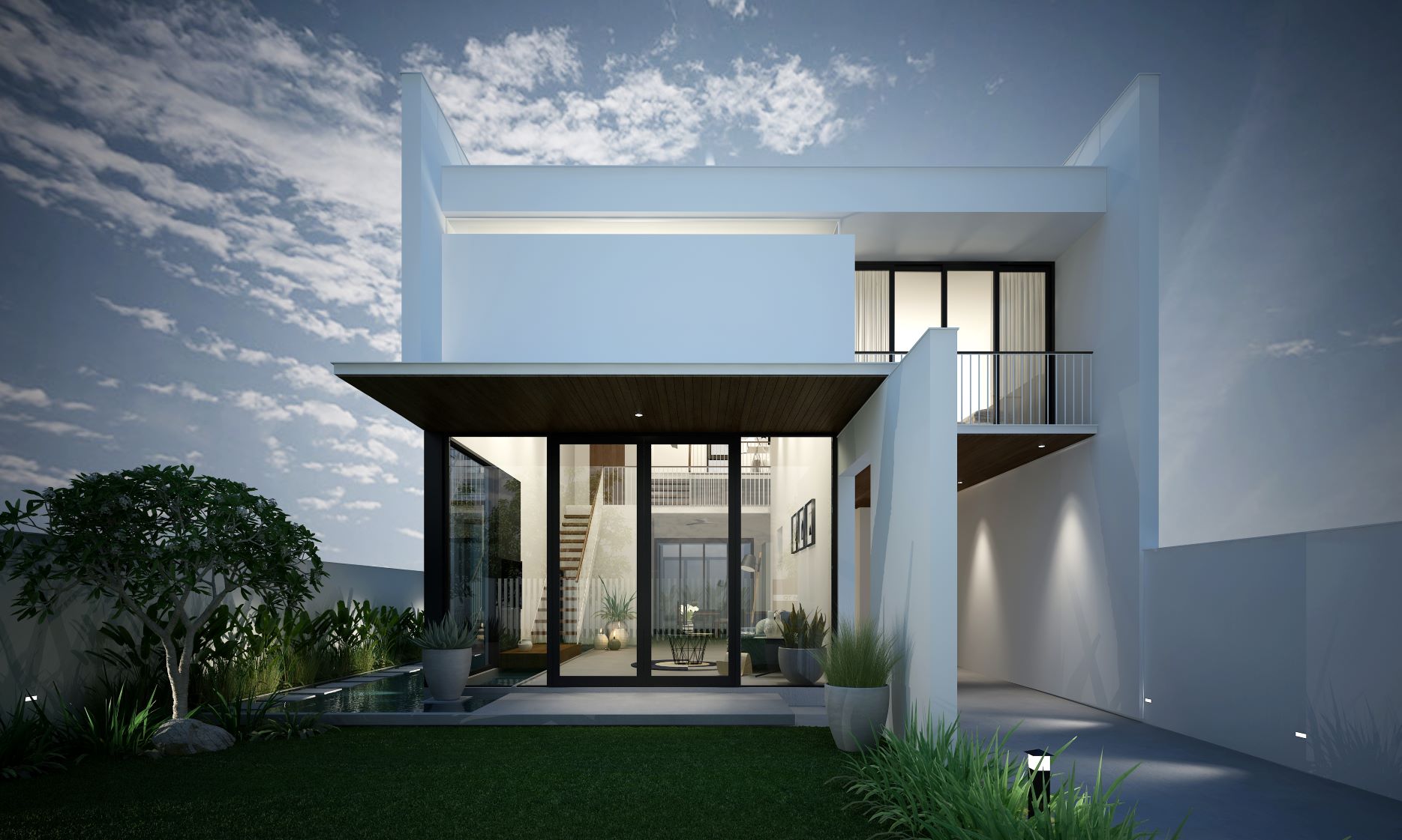 The conceptual design of a house for a young couple with two children. The exterior is featured with two white boxes that are nested to each other, providing a straight appearance and fresh looking in the first impression.