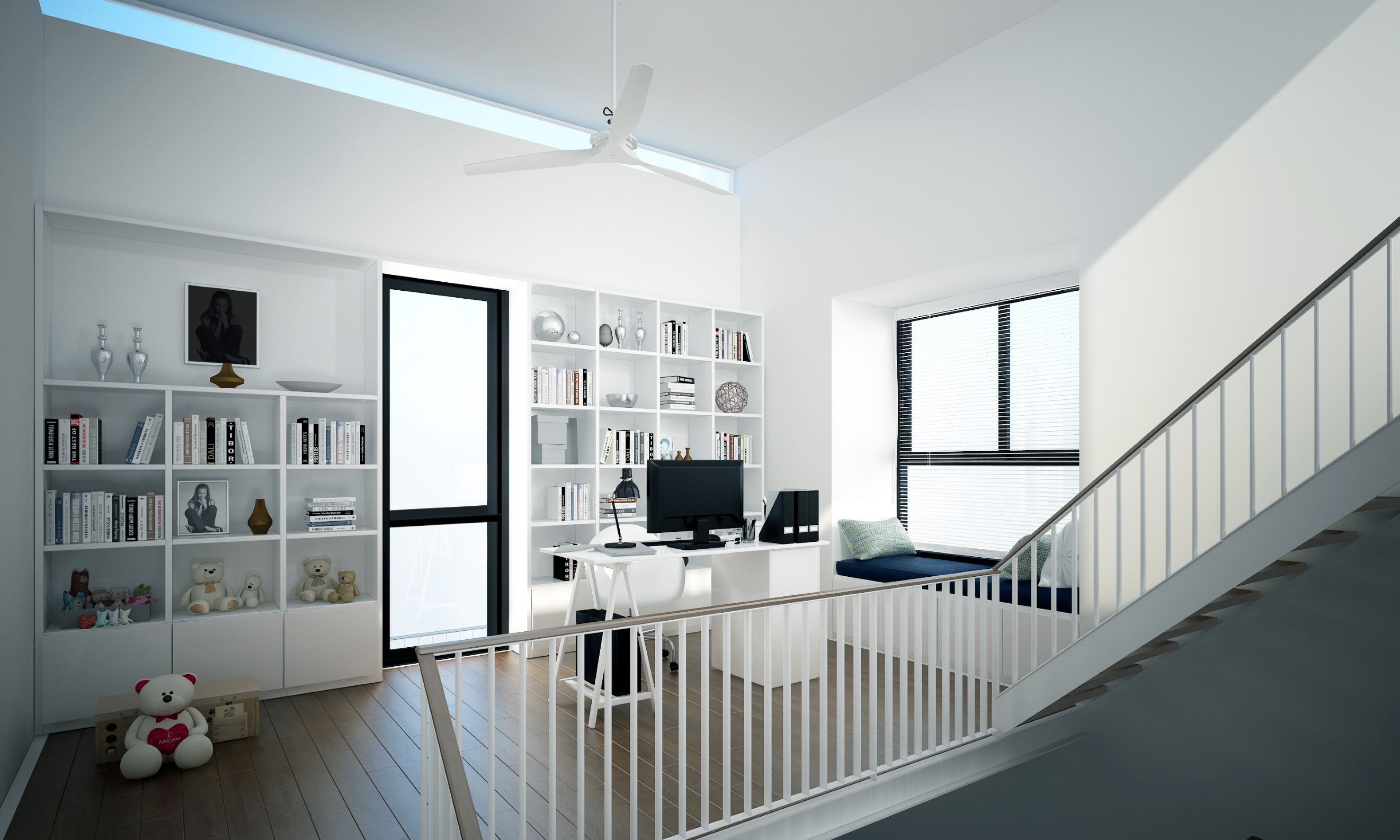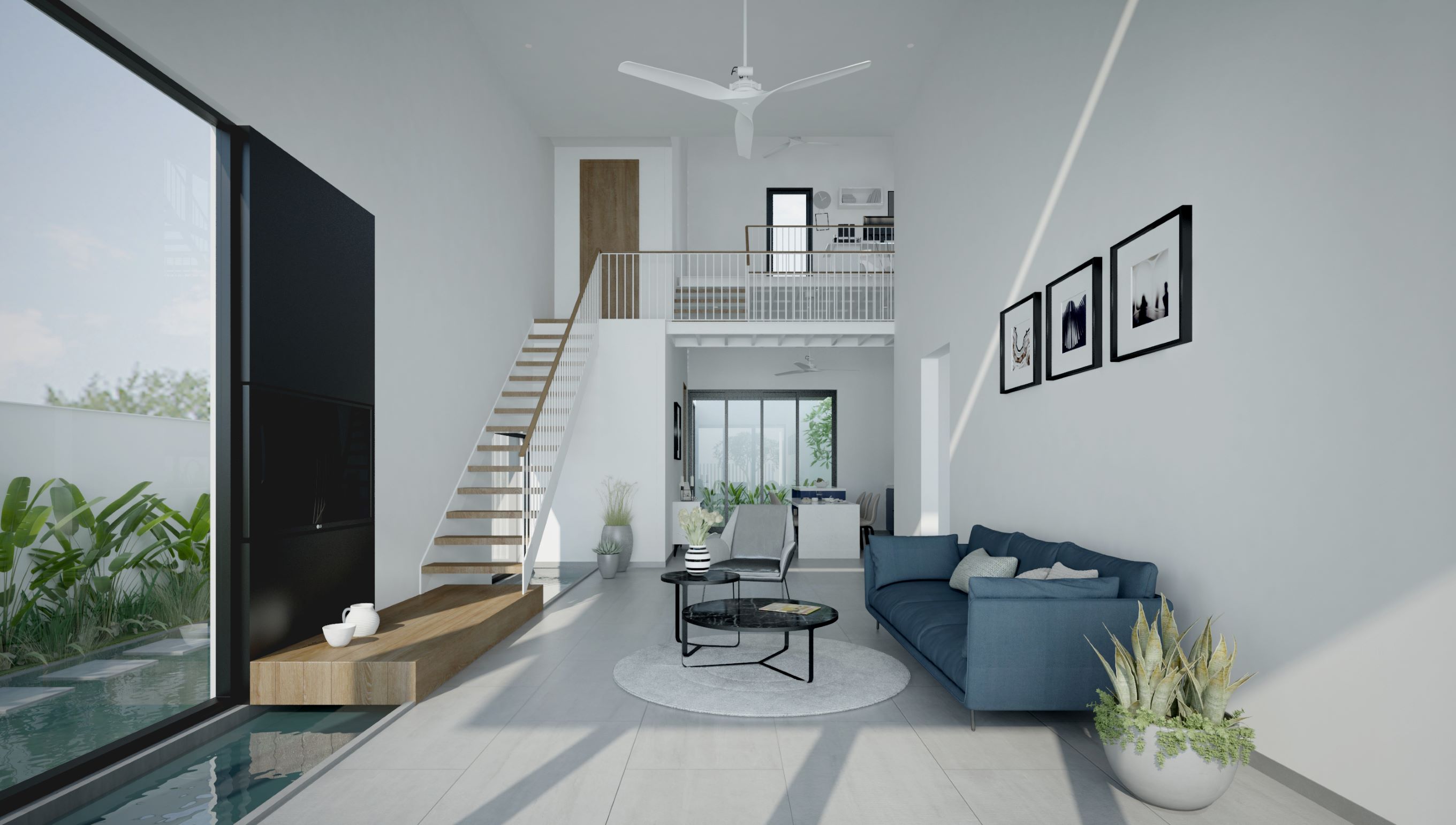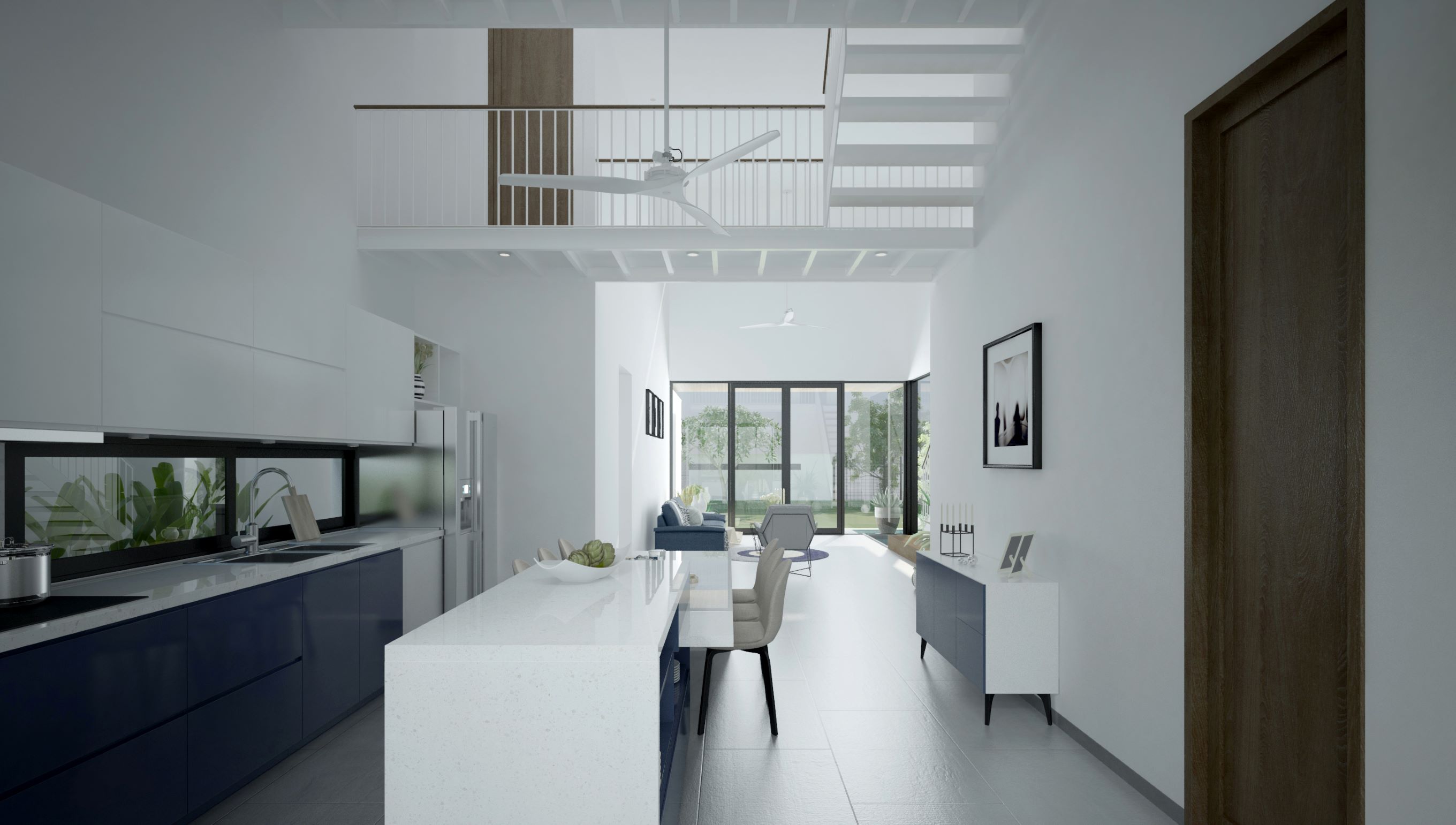 The conceptual design of a house for a young couple with two children. The exterior is featured with two white boxes that are nested to each other, providing a straight appearance and fresh looking in the first impression.